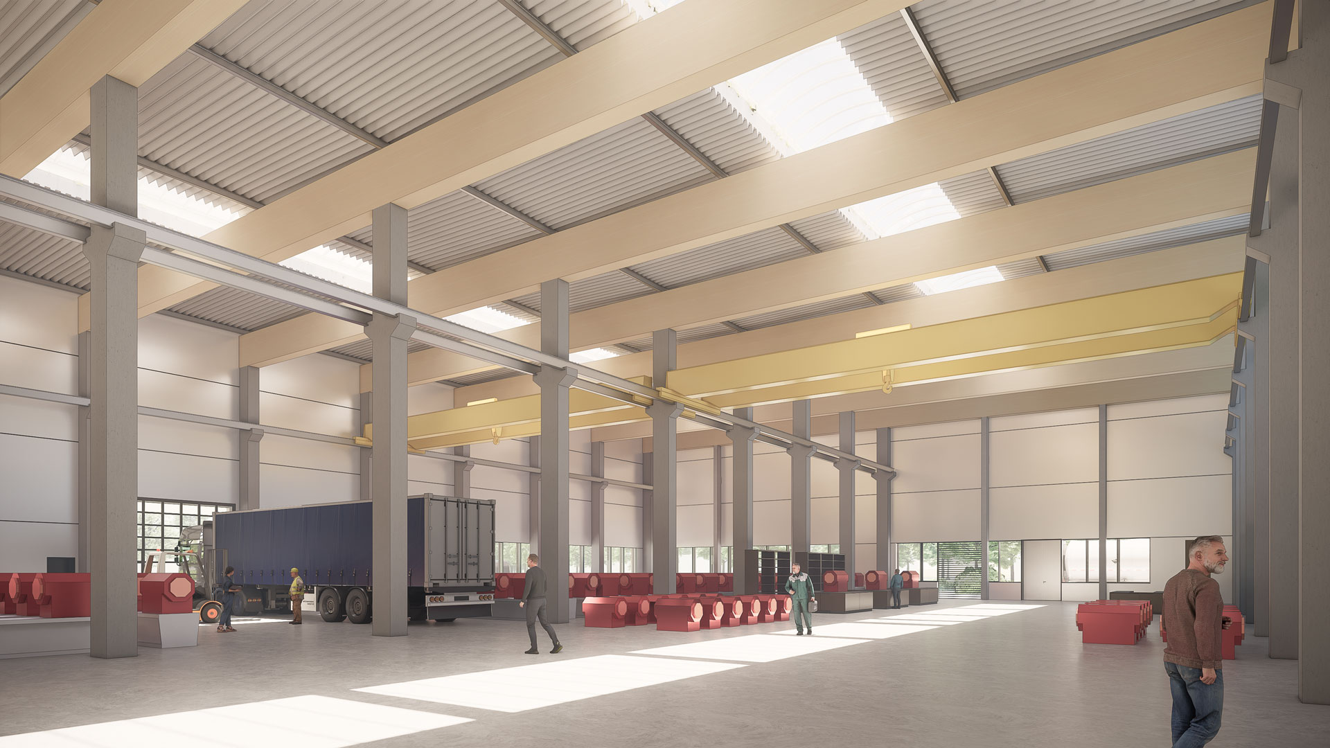 Das Umfeld des Neubaus ist geprägt von Logistik- und Verkehrsflächen, Feuerwehrzonen und einem repräsentativen Vorplatz, der zusammen mit dem benachbarten DESYUM und dem geplanten ITGZ I das neue Eingangstor des Campus bildet. Der kompakte Baukörper umfasst eine dreischiffige Halle mit 18 m Achsabständen und drei Kranbahnen. Eine Stahl-Skelettkonstruktion in Kombination mit Holztragwerksteilen, Fachwerkträgern im Dach und hoher Lastreserve ermöglicht flexible Nutzungen. In der ersten Phase entstehen Lager-, Montage- und klimastabile Bereiche, ergänzt um Sozial- und Technikflächen.