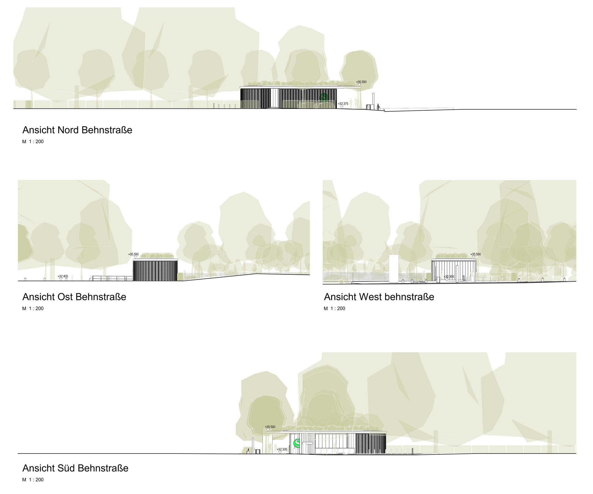 An der Königstraße entsteht ein prominentes, jedoch zurückhaltendes ovales Zugangsgebäude, das auf dem Vorplatz des neuen Schulcampus liegt. Die Form ermöglicht eine multidirektionale Erreichbarkeit von Bushaltestelle, Elmenhorststraße, Struenseestraße und Campus und schafft eine klare Verknüpfung zwischen Stadt, Verkehr und Bildung. An der Behnstraße wird der neue Zugang kompakter ausgebildet und fügt sich sensibel in die kleinteilige Umgebung ein, mit klar definiertem Abschluss zum angrenzenden Spielplatz und Beibehaltung der Orientierung zur Königstraße/Struenseestraße.