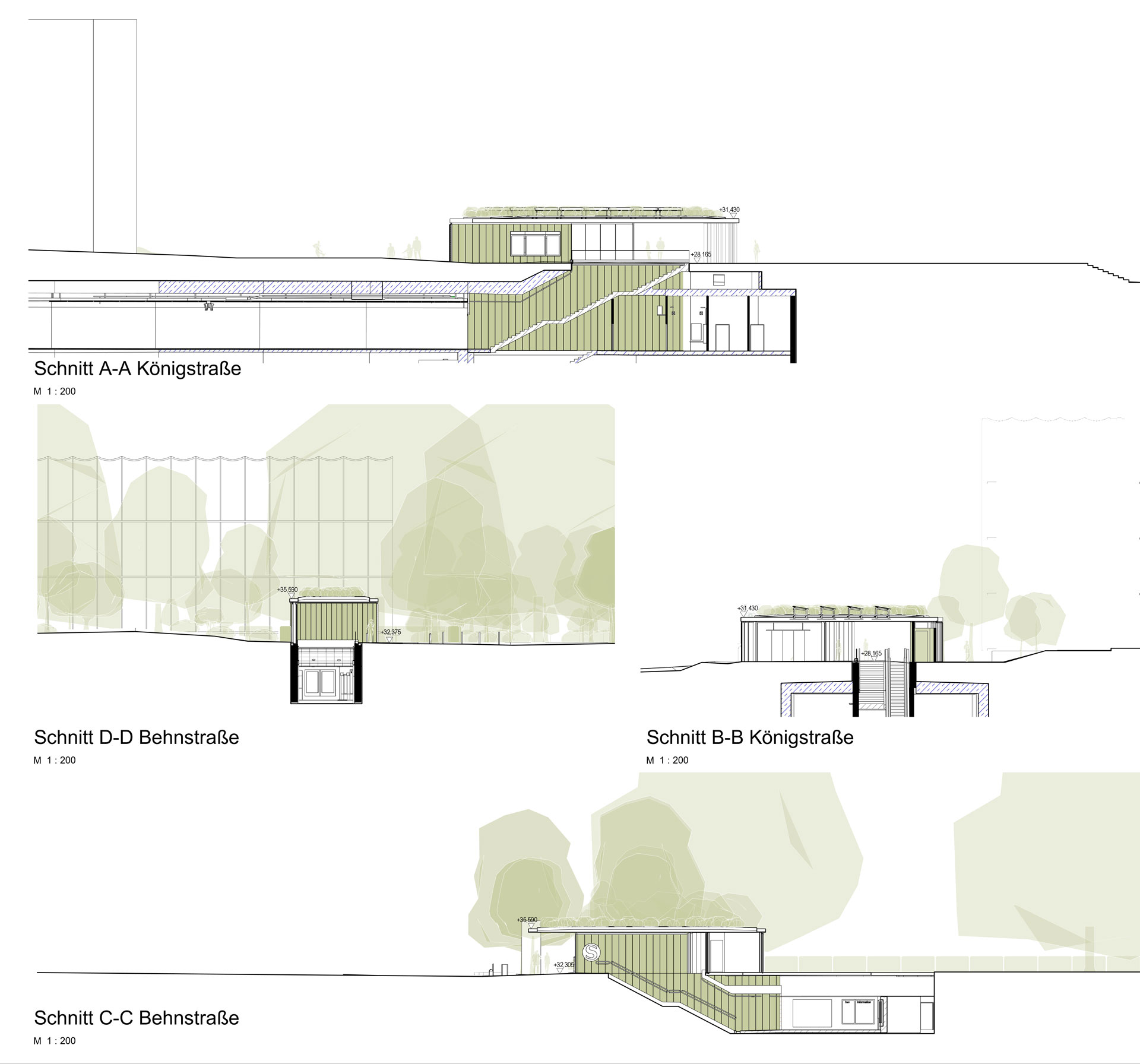 Funktional sind die Nutzungen klar strukturiert: In der Königstraße gliedern sich Service-Store, Automaten, Treppe und Aufzug sowie technische Räume in zwei übersichtliche Volumina. An der Behnstraße sind die Funktionen kompakter organisiert, mit gut sichtbarem Zugang und integrierter Müllstation.